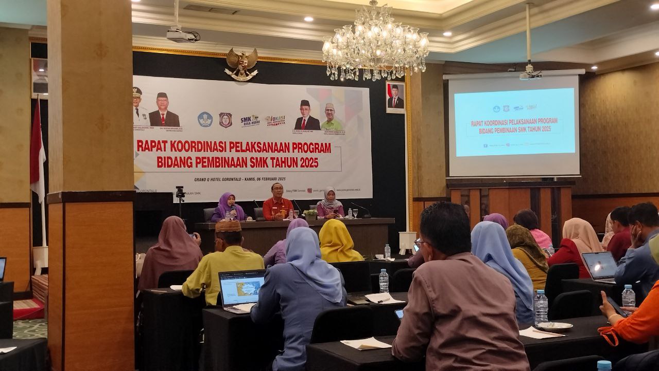 Kegiatan Rakor Bidang SMK yang dilaksanakan di Ballroom Hotel Grand Q Kota Gorontalo diikuti oleh seluruh Kepala Satuan Pendidikan jenjang SMK Negeri dan Swasta. Kegiatan yang berlangsung pada tanggal 06 Pebruari 2025 merupakan langkah konkrit yang dilaksanakan oleh bidang SMK serta menjadi acuan untuk satuan pendidikan.
